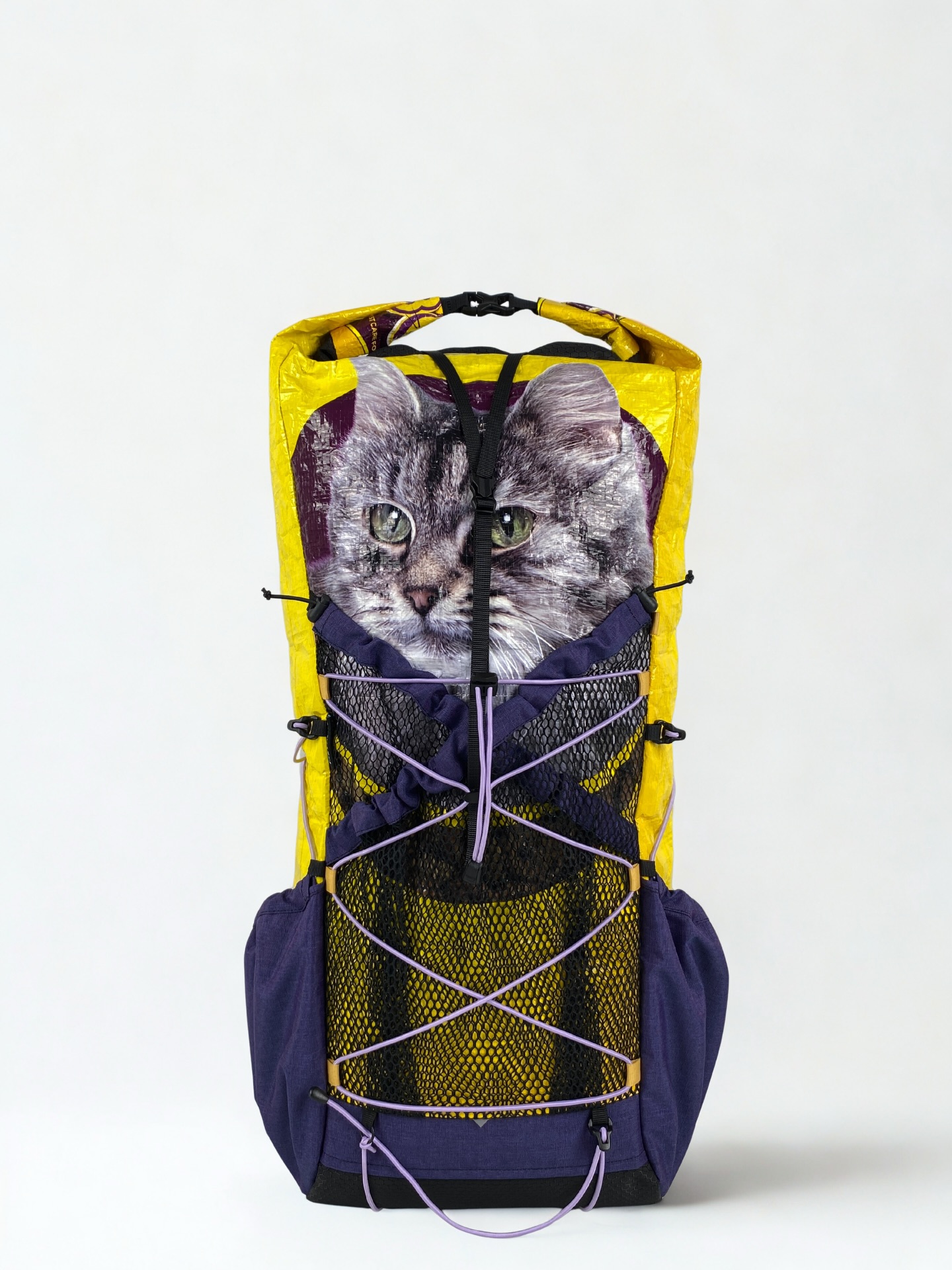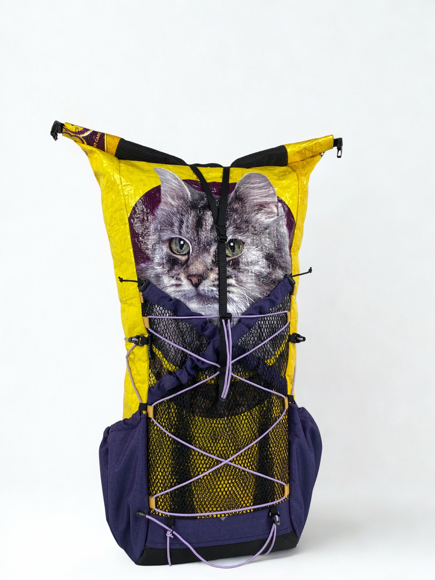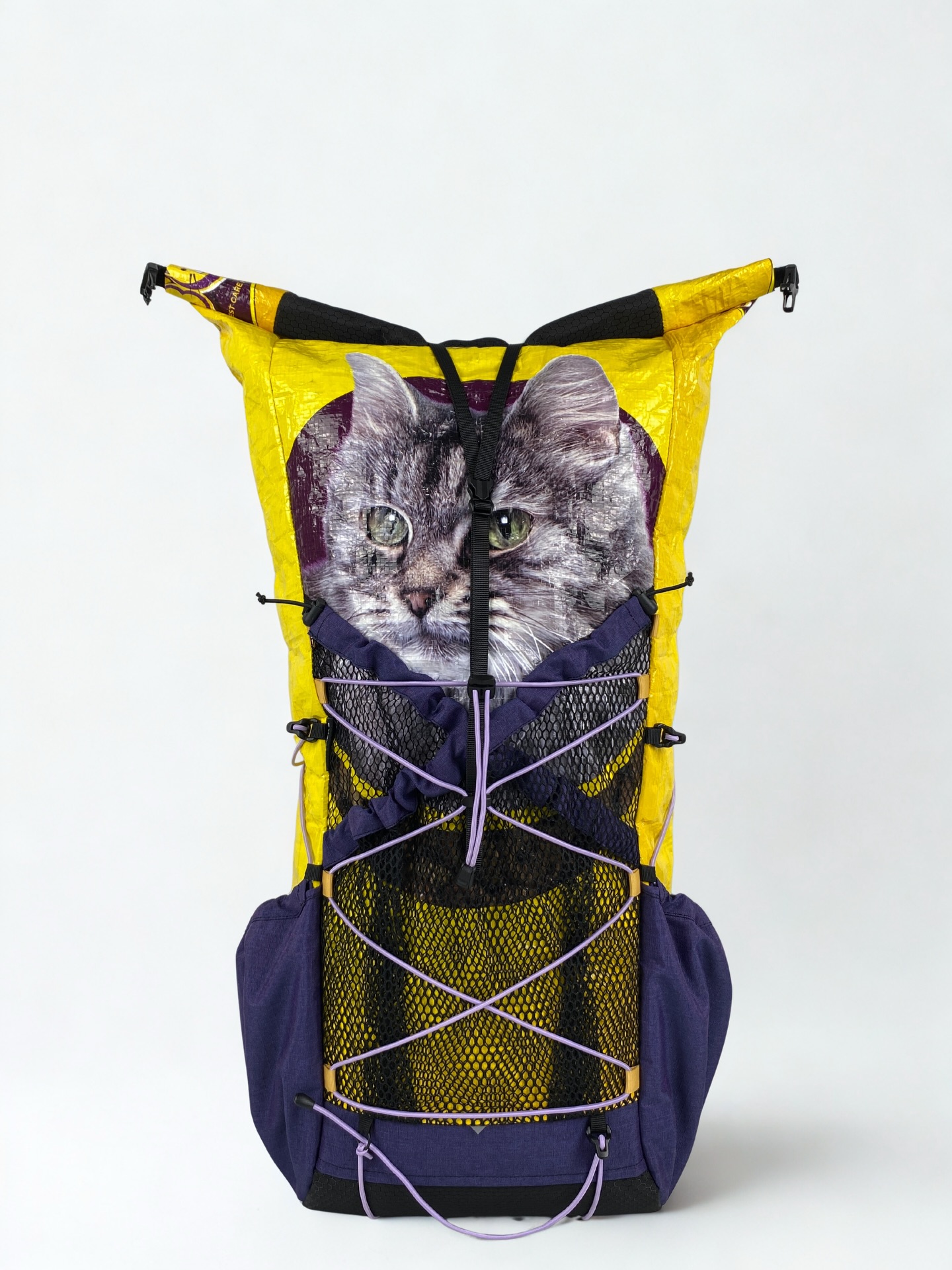 既然YSR新增了紫色布料,店長就想搞搞新意思,也嘗試應用在貓糧袋上看看。這次用上黃色的大頭貓糧袋,兩邊側袋也用上紫色的尼龍布。前面大口袋亦用了雙袋設計,不過今次前面兩個口袋皆用上經典的尼龍蜂巢網袋設計,並用上紫色尼龍布作邊緣修飾,這次透視感極高了。全個背囊除了背部橡筋繩,其他地方皆用上紫色橡筋繩作襯托。袋正面的圈圈也改為面色,細節感滿滿,也是一個令人眼前一亮的作品。