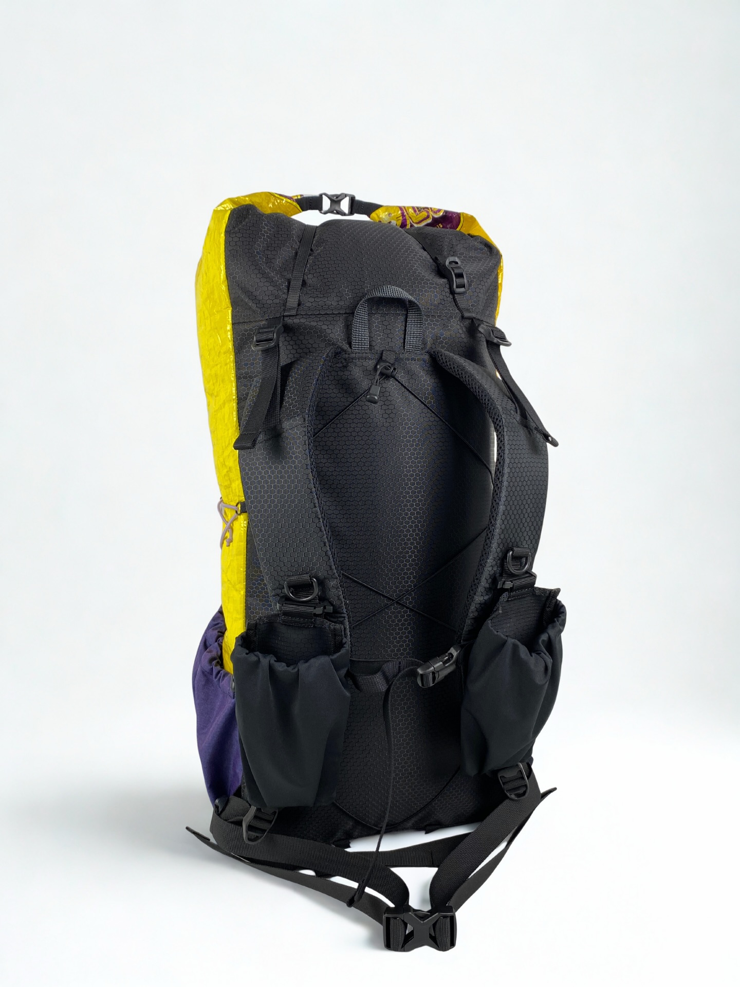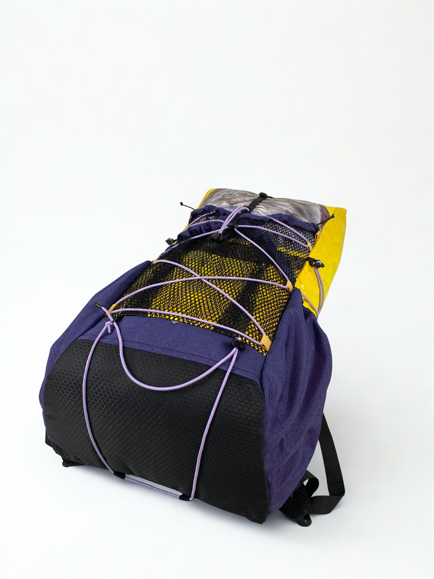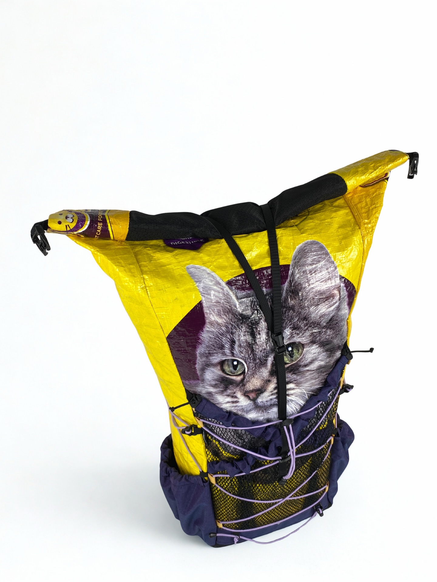 既然YSR新增了紫色布料,店長就想搞搞新意思,也嘗試應用在貓糧袋上看看。這次用上黃色的大頭貓糧袋,兩邊側袋也用上紫色的尼龍布。前面大口袋亦用了雙袋設計,不過今次前面兩個口袋皆用上經典的尼龍蜂巢網袋設計,並用上紫色尼龍布作邊緣修飾,這次透視感極高了。全個背囊除了背部橡筋繩,其他地方皆用上紫色橡筋繩作襯托。袋正面的圈圈也改為面色,細節感滿滿,也是一個令人眼前一亮的作品。